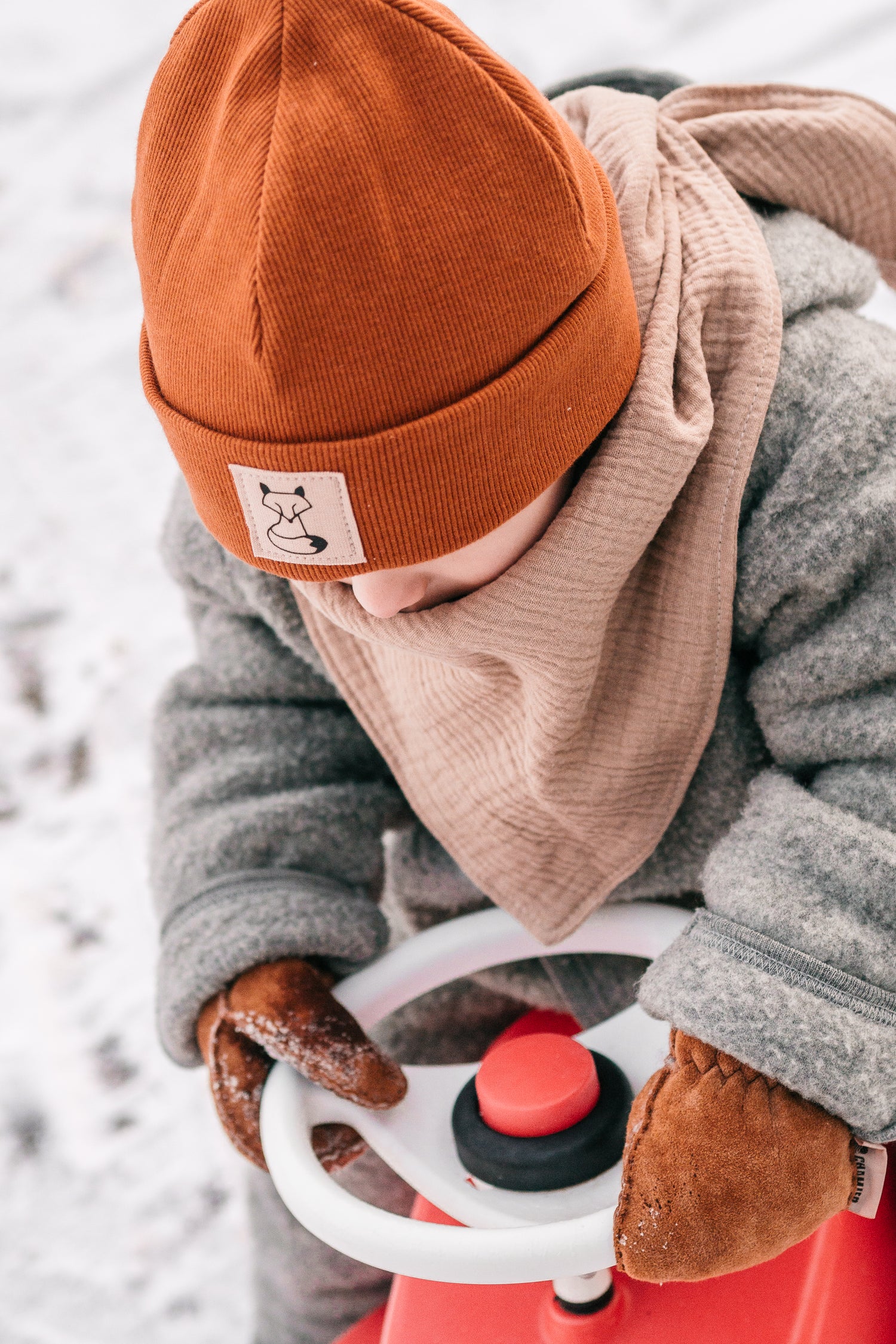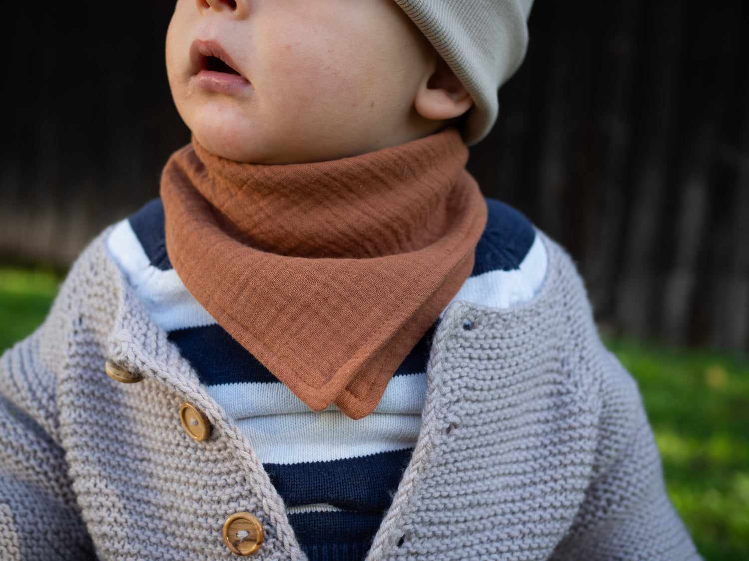 Ein doppelt liegendes Halstuch aus insgesamt vier Lagen Baumwollmusselin die z.B. in Zahnungsphasen sehr nützlich als Saugmaterial sind. Es schützt den Hals vor Wind und wärmt bei kühleren Temperaturen in der Übergangszeit. Aber auch im Winter leistet es z.B. unter einem Wollwalkwanzug tolle Dienste.