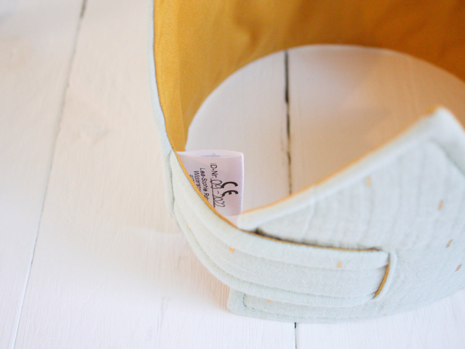 Sie besteht aus einem cremefarbenen Baumwoll-Musselin mit goldenen Strichen sowie einem Innenstoff aus Bio-Baumwolle.