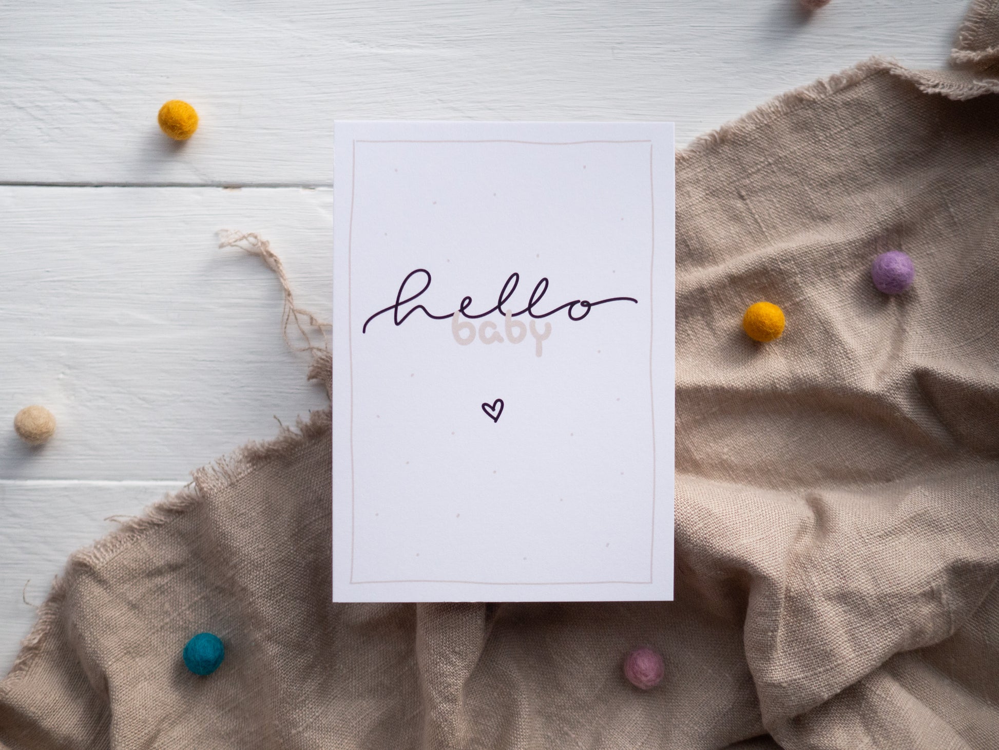 Liebevoll illustrierte Postkarte zur Geburt in schönen neutralen Farben und dem Spruch: "hello baby". Perfekt wenn das Geschlecht noch nicht bekannt ist, oder auch zum immer auf Lager haben. Mit der Karte rundest du dein handgemachtes Geschenk perfekt ab.